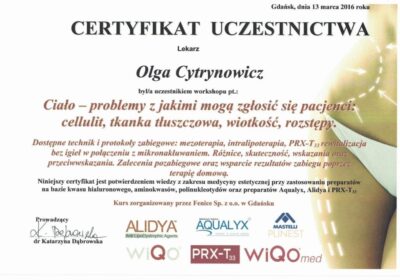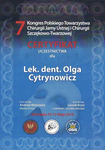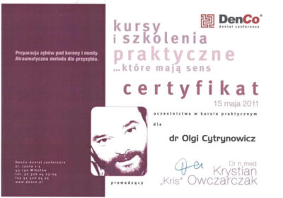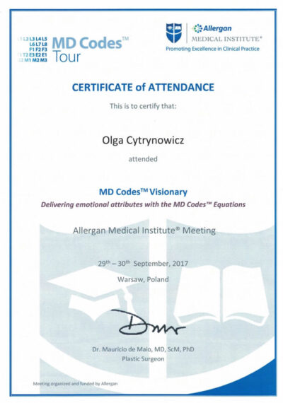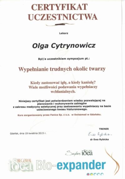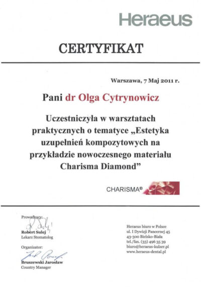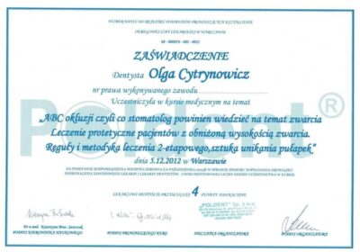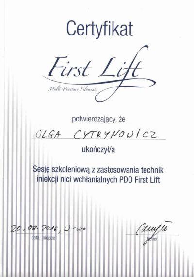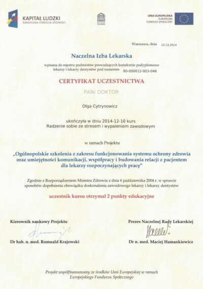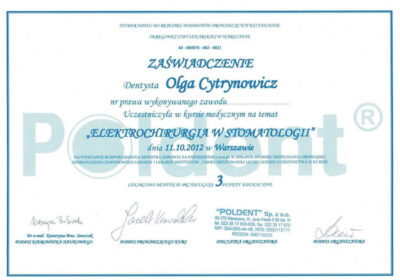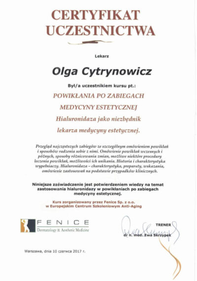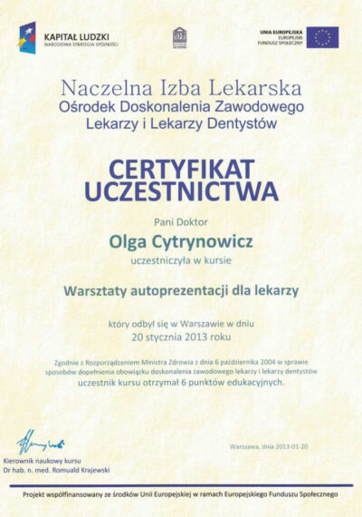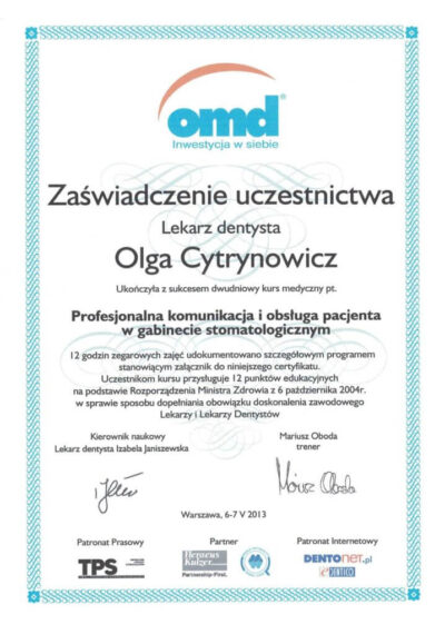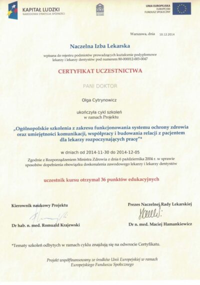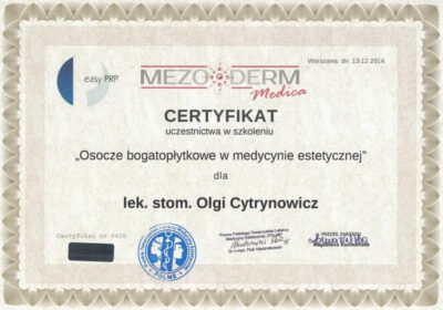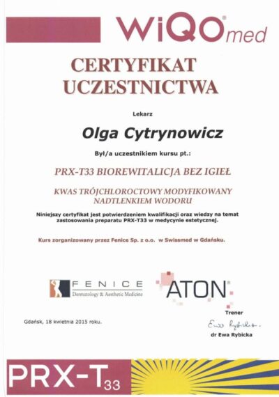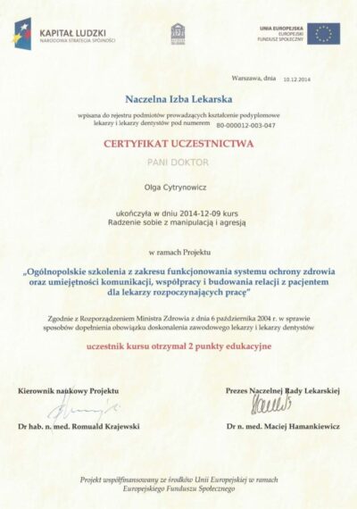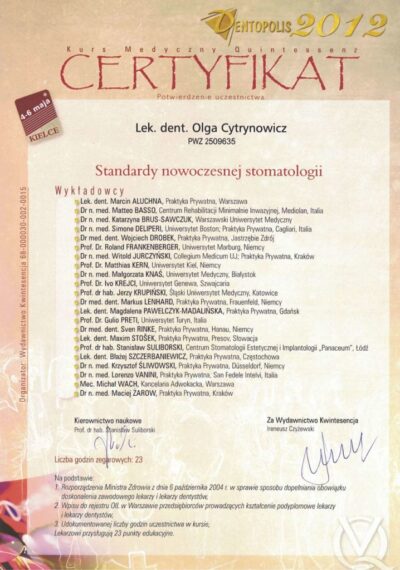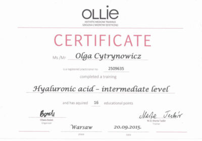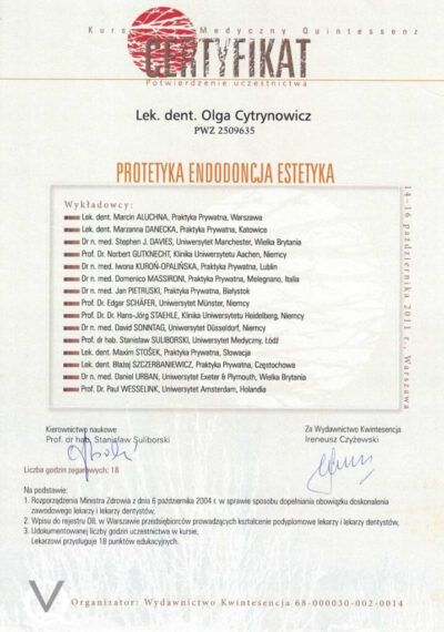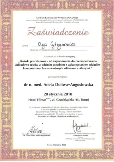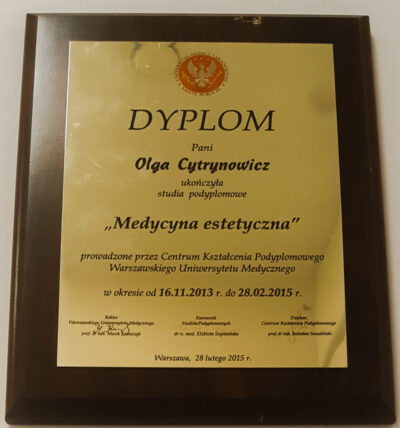 Lekarz dentysta od 2010 roku i absolwentka podyplomowych studiów z medycyny estetycznej na Warszawskim Uniwersytecie Medycznym w 2015 r.